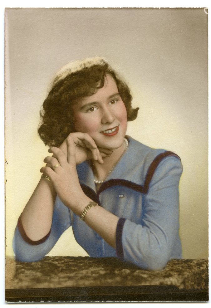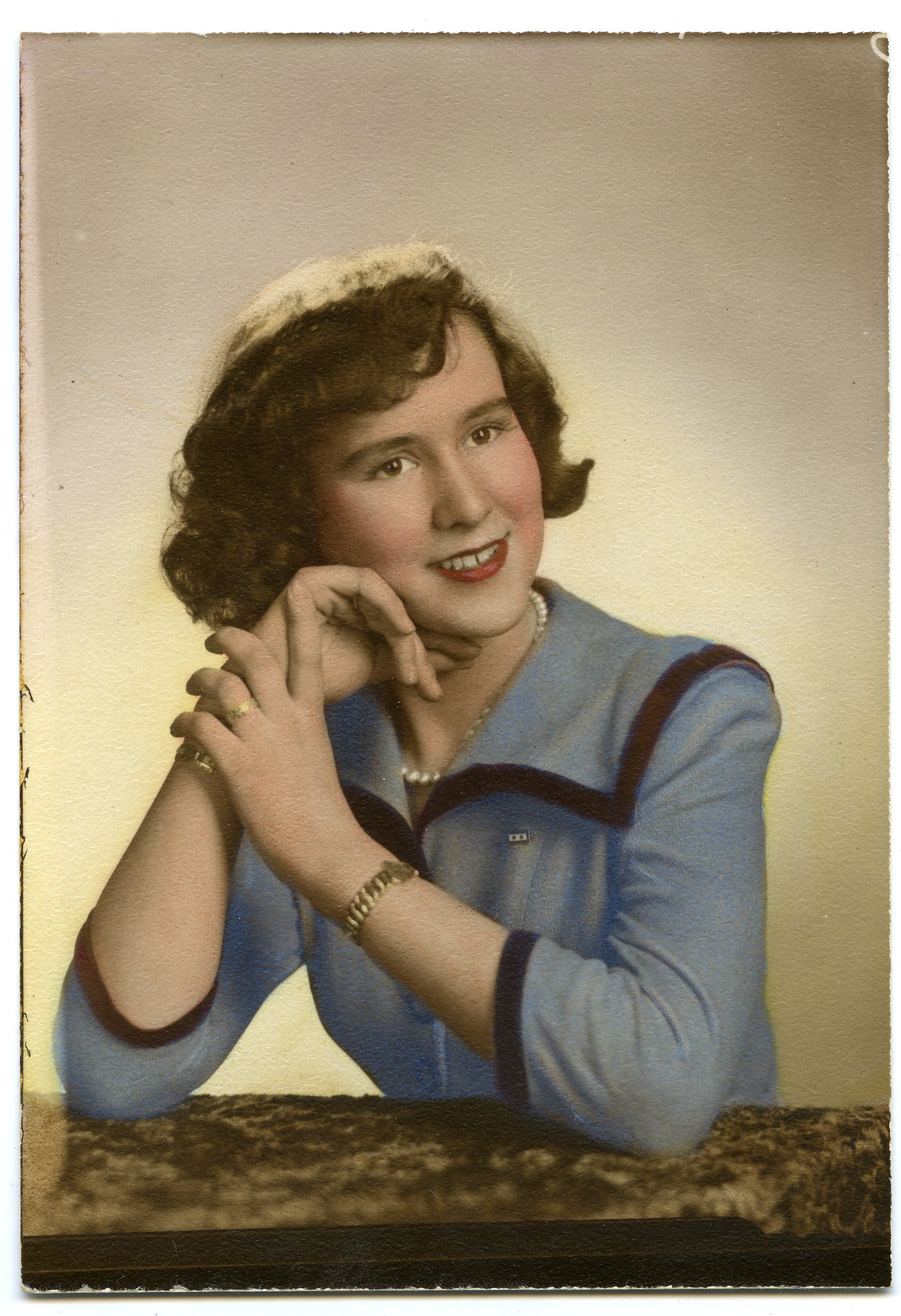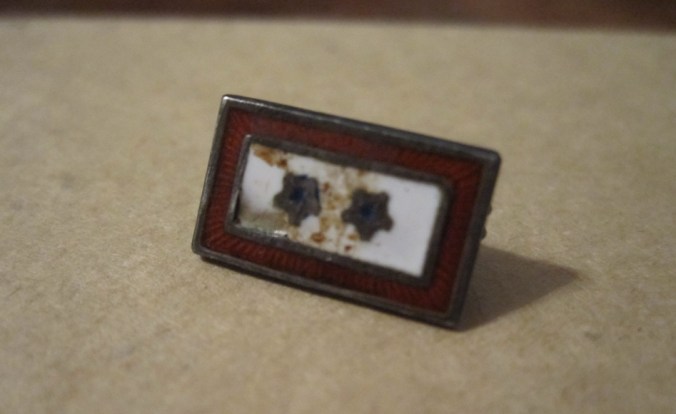 Hand tinted photos normally are poorly done with little attention to detail. This hand tinted portrait photo was masterfully created with crisp detail to the pins and bracelets. The small pin on the girls lapel is known as a son-in-service pin and was normally worn by family members who had relatives, specifically brothers and sons, who were serving in the armed forces. She is also wearing a son-in-service bracelet, and a “stretchy” heart bracelet, possibly from a boyfriend? Who knows? A real gem!