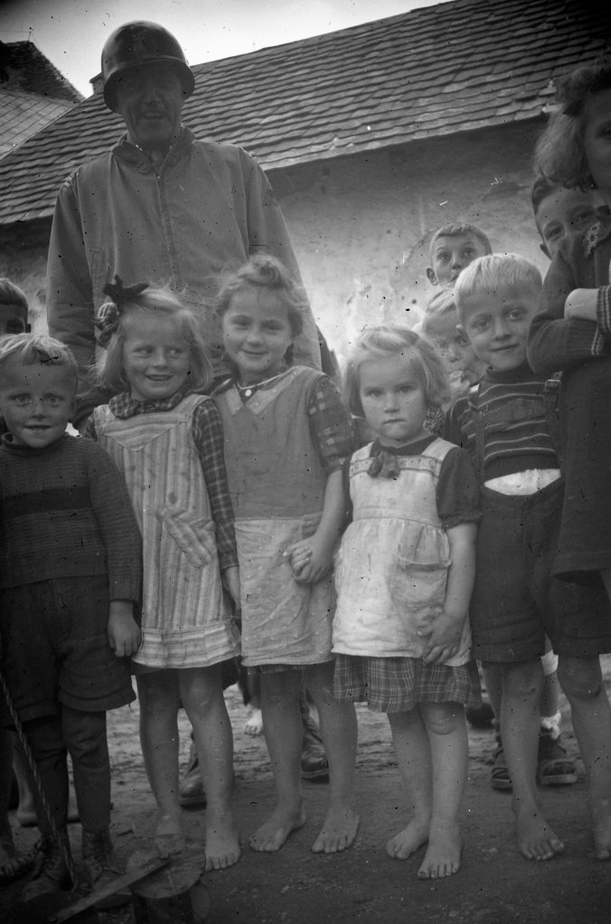 As I sift through a recent WWII negative acquisition of 600+ images taken by a Catholic chaplain of the 9th Armored Division, I couldn’t help but post the following series of shots taken somewhere near Regensburg Germany. They show a group of German orphans standing in the rubble of a demolished building. The happy smiles belie the true sadness these children must have felt as they lost their families.