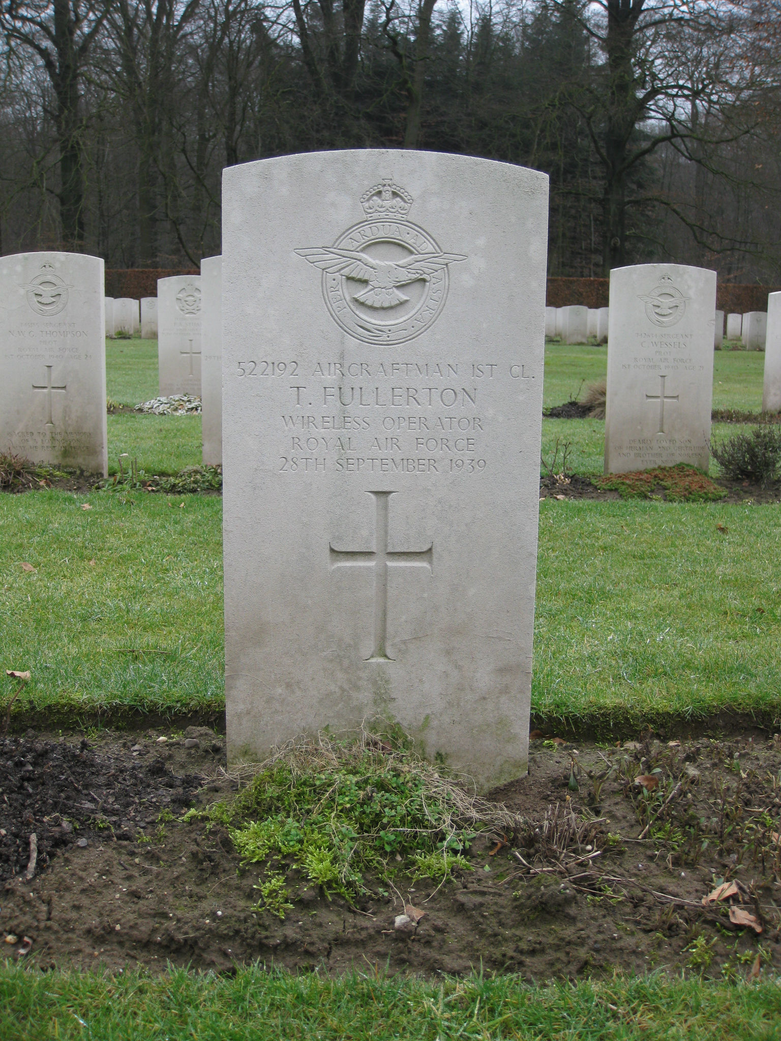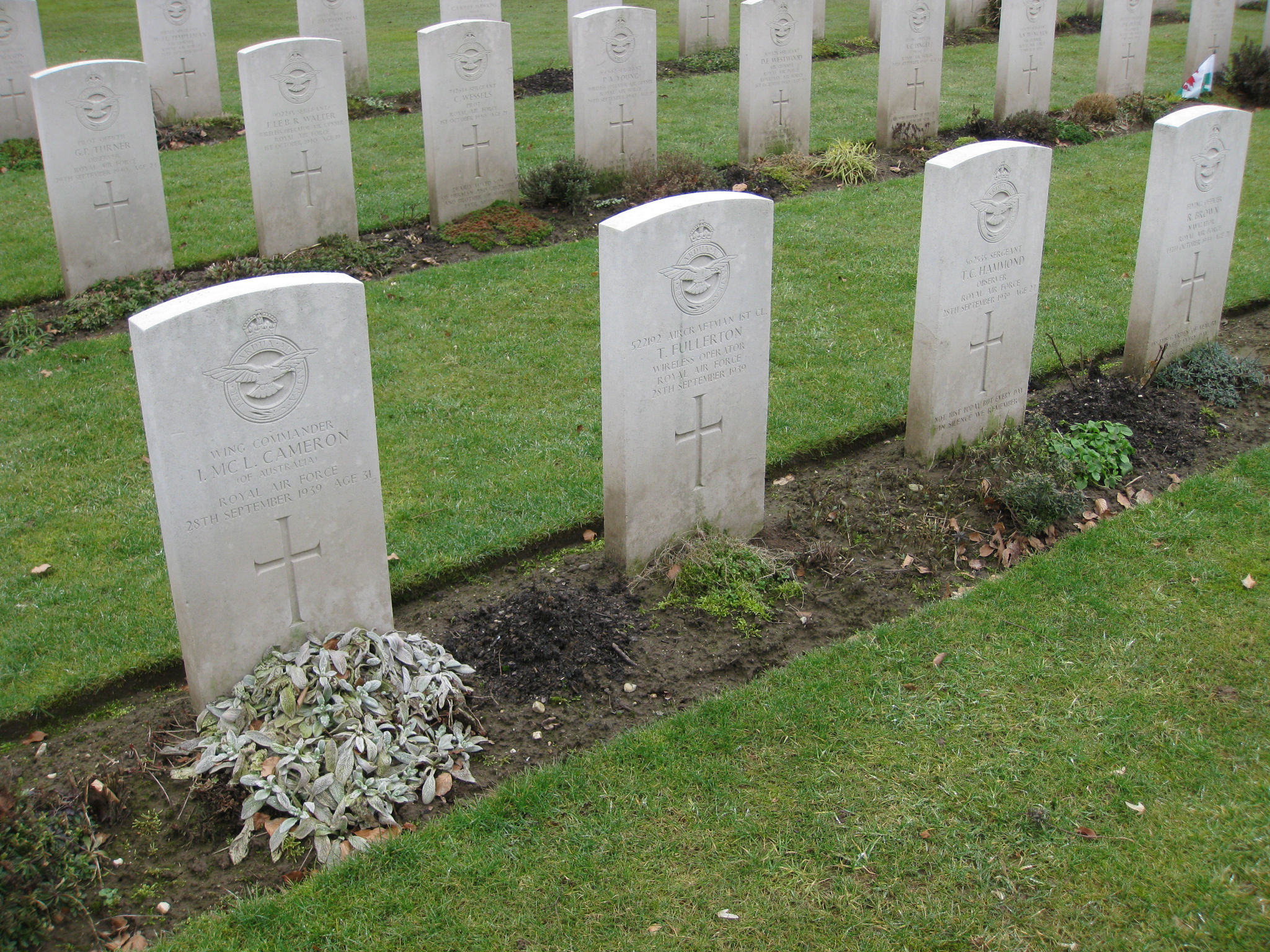 It turns out that the man buried on the right is wing commander Ivan McLoed Cameron, an Australian who, in fact, is the first Australian to die in action during WWII. The man to the left is Thomas Cecil Hammond, an Irishman.  The last grave belongs to Thomas Fullerton.