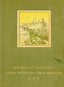 Following up on a series of posts on the World War One Historical Association blog (http://ww1ha.wordpress.com/) regarding dust jacket art from the WWI era, I’ve decided to begin posting some of my favorite examples of war-era cover art. This example is from a copy of the unit history for Company F of the 316th Infantry Regiment. The cover and internal art was designed by a regimental veteran named Thomas M. Rivel who received the Distinguished Service Cross for his action outside Montfaucon, France in 1918. His cover piece combines a few elements that are commonly seen in wartime cover art, including posies, trench details, aircraft and a stone-faced doughboy. A great piece!