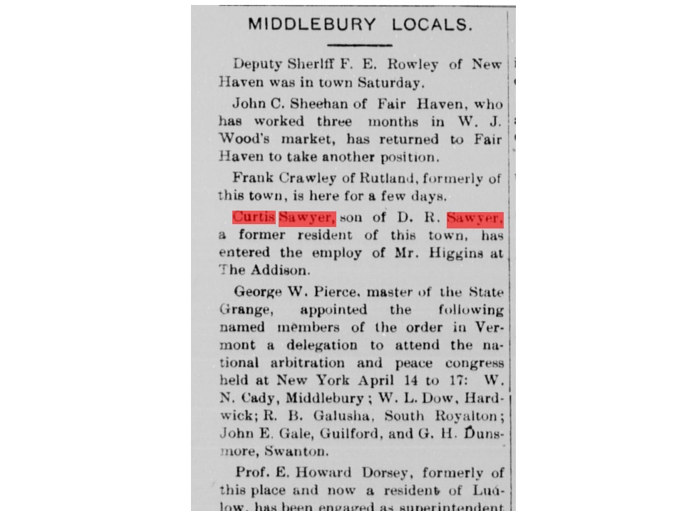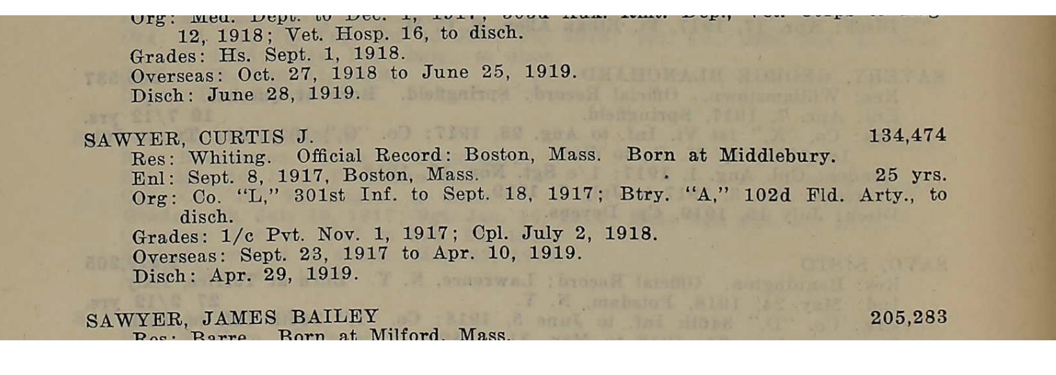 My passion for WWI Vermont material is endless and I make every effort to track down unique, original photos and objects related to Vermonters in the Great War. It’s not easy to find and often comes at a price; 26th Division material is popular with French collectors and fetches a high price when purchased on eBay. In this case, I was able to purchase a studio photo of a 102nd Field Artillery Vermonter of Battery A . Curtis J. Sawyer was born in Middlebury, VT on September 13th, 1893 – nearly 120 years ago!