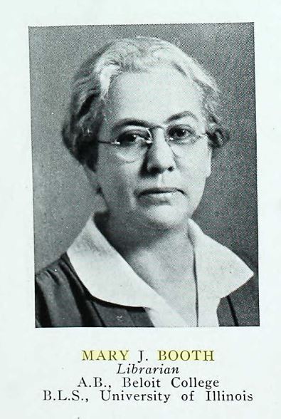 Mary Josephine Booth was born in Beloit, WI on May 24th, 1876 to John Robertson Booth of Fonde, NY.  She earned degrees from Beloit College and the University of Illinois Library School.