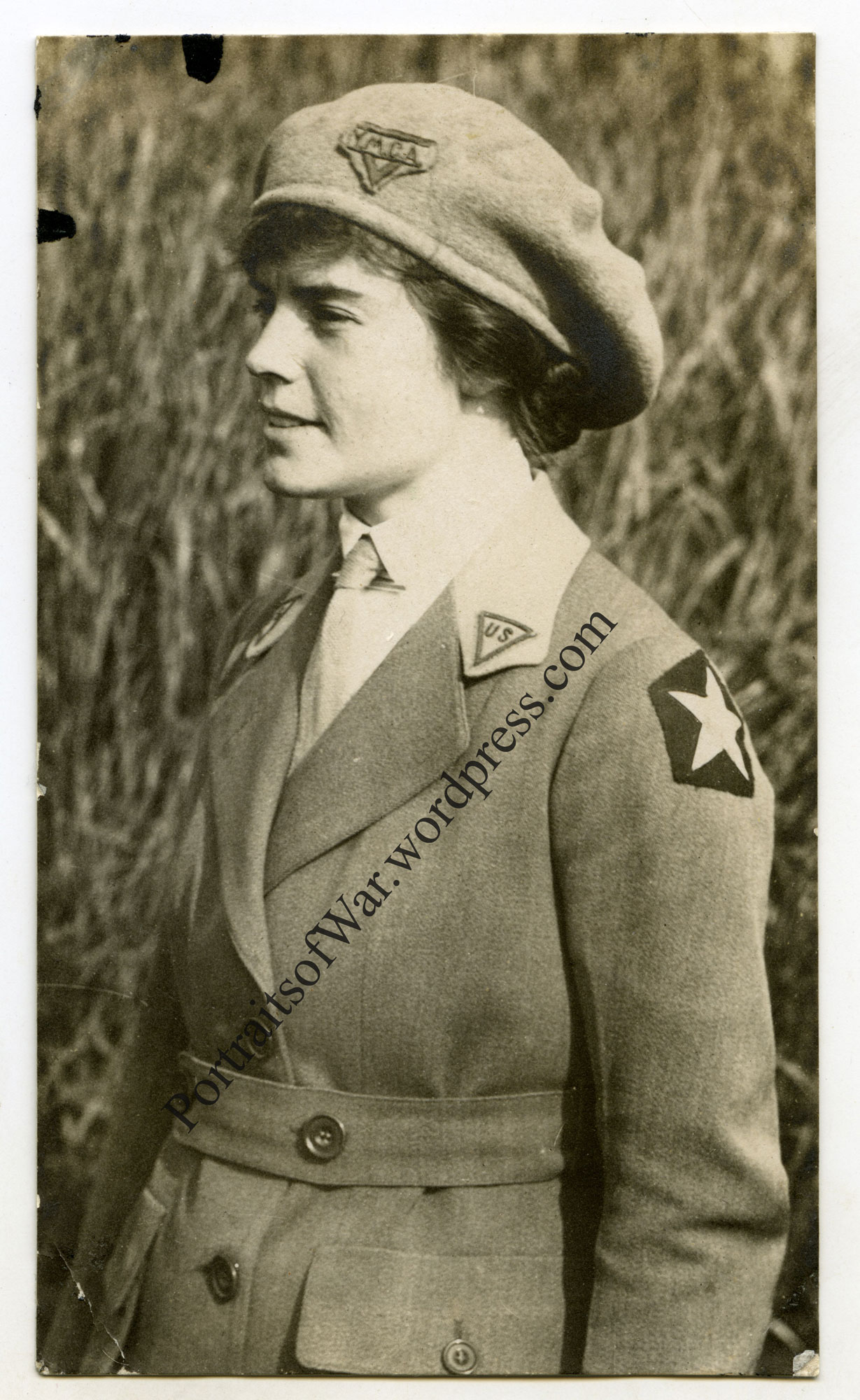 Through a collecting friend and author I was able to obtain a nice side profile shot of a YMCA woman associated with the 9th Infantry Regiment of the 2nd Division.  The uniforms for the female YMCA workers was designed by Mrs. Theodore Roosevelt and was a gray-green in color with a French horizon-blue collar.  The pair of US triangles on the upper collar lapel were embroidered in silk and sported red-edged details.  This particular woman is wearing an incredibly rare beret stye hat with a felt YMCA patch attached.