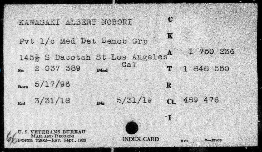 Albert Nobori Kawasaki was born in Honolulu, within the Republic of Hawaii, on May 17th, 1896. His parents were Japanese immigrants from the Hiroshima Prefecture, and government documents indicate that Albert spent six years in Japan attending school during his youth. He was bilingual in Japanese and English, and later moved to Sacramento, California (possibly in 1914). He was a student at the Sacramento High School during the 1917 draft registration and denied any deferments from military service. Albert was subsequently inducted into the US Army on March 31st, 1918, and was soon assigned as a Private First Class with the US Army Medical Corps.