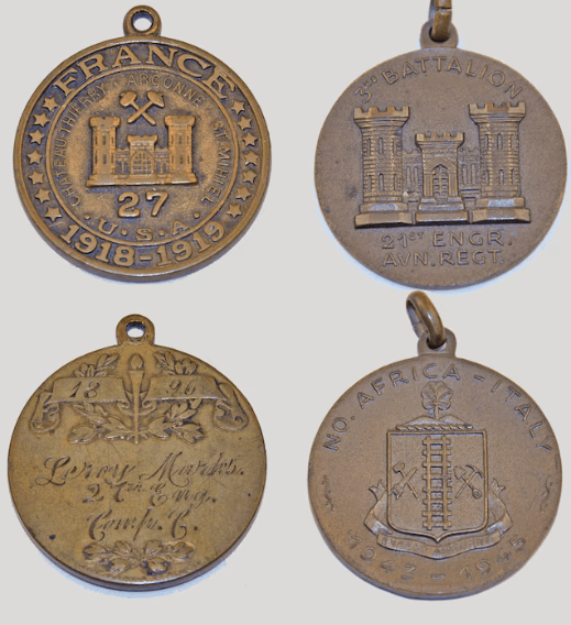 The tag that I had originally assumed was some sort of identifier appears to have a castle at center which may be a 27th Engineers commemorative medal given out to members of that unit. See below (top left) for a possible match from the US Army Engineering collection website. (Image 16 in the first slideshow)