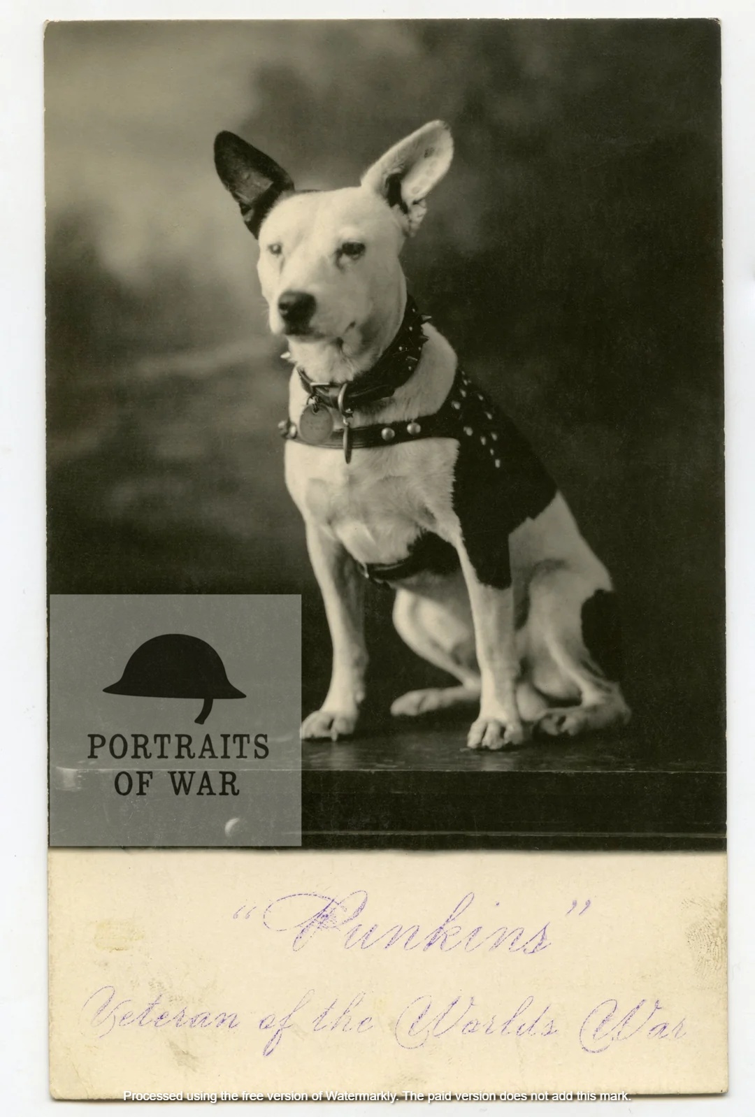 Sporting a studded leather collar and matching riveted harness, Punkins seems like a quite the bruiser, a fitting mascot for an engineering regiment during WWI. With just the image and brief stamped caption below (the stamping hints at a volumed production of photo postcards for veterans after the return home), it seemed a difficult task to identify the sitter based on contextual clues such as insignia or other identifying material. Although the postcard backstamp suggests a stateside printing of the postcard, I’m guessing the original photograph was taken in France or Germany and replicated stateside for dispersal to fellow soldiers who wanted photographs to remember their wartime experiences.
