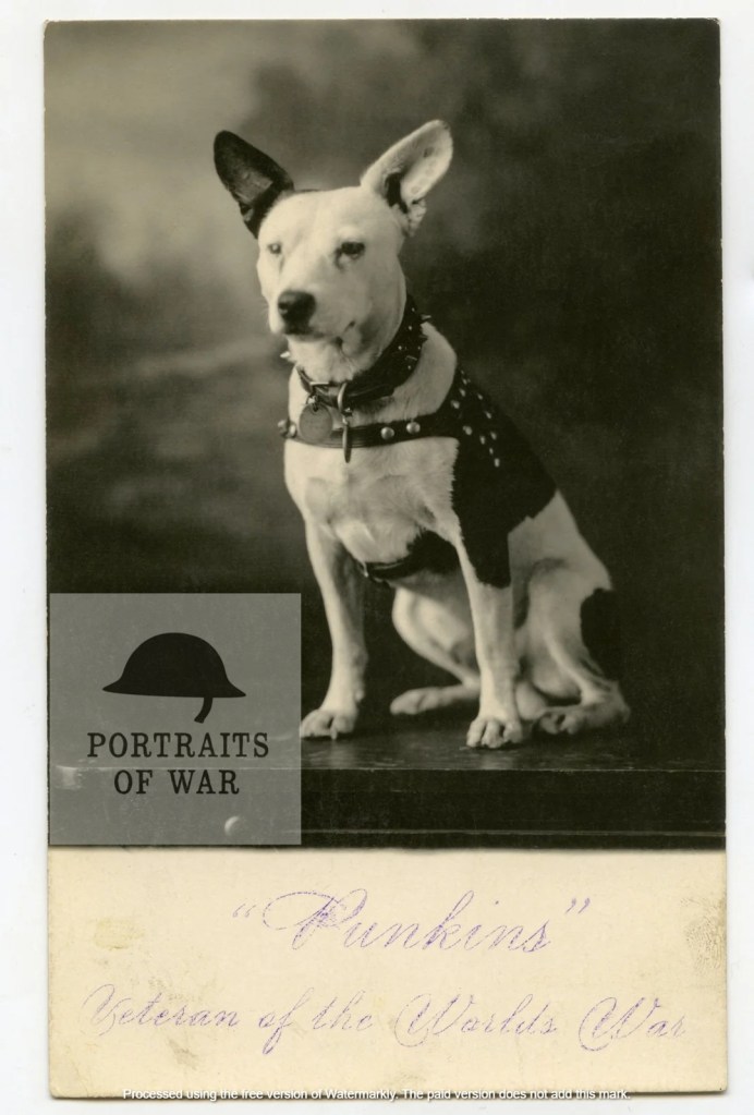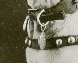 One last note – Punkins appears to be wearing an actual WWI US dog tag. Dog tags used by the US Army and Marines were primarily aluminum discs that could be hand punched with pertinent information bearing the owners name, unit, serial number and sometimes other personal touches. It looks like Punkins received a set of his own tags although the details are obscured. Note that the ridges on the left tag hole hints that they’ve been worn long enough to encounter some wear and tear. The circular tag to the right doesn’t seem to be a proverbial dog tag but some sort of other identifier or an actual DOG tag.