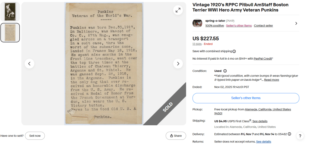 It appears that Punkins sat for several photographs during his illustrious career as a mascot. Another eBay listing appeared a month or so ago (I didn’t win) that provided a bit more information about our sitter. Amazingly, we now know the birthdate, birthplace and wartime career of Punkins to a level of detail I never thought I would learn. See below for a transcription of the caption from the eBay postcard.