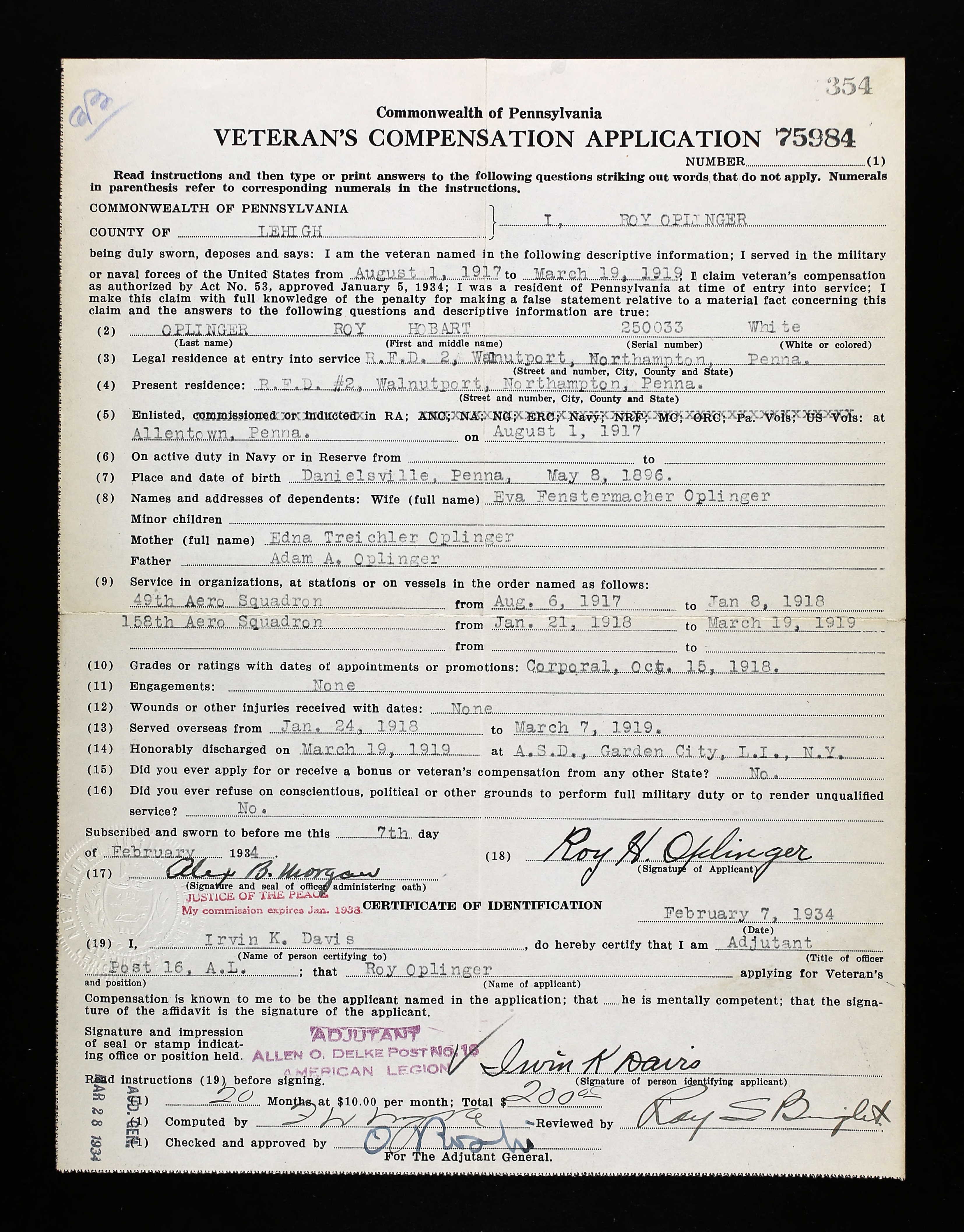 The additional clues are pretty obvious given the stamp at the top right-hand corner paired with the writing on the bottom. We know his name is Roy, and that his Army Service Number was 250033. Using the powers of ancestry.com and fold3.com I was able to identify the sender as Corporal Roy Holden Oplinger who served as a mechanic with the 158th Aero Squadron. Born on May 8th, 1896 in Danielsville, PA to Adam and Edna Oplinger, Roy went on to enlist for the draft on June 5th, 1917 with a listed address in Walnutport, PA. What doesn’t jive is that he was a private at the time of the sinking of the SS Tuscania, so it appears that he didn’t actually send this postcard to his family (if ever) until later that year when he was promoted to corporal in October.