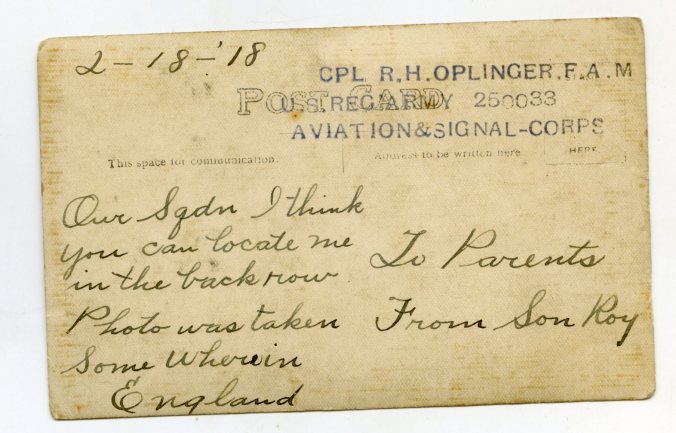 Address, Priv. Roy H. Oplinger, 158th Aero Squadron. A. E. (via) N. Y.