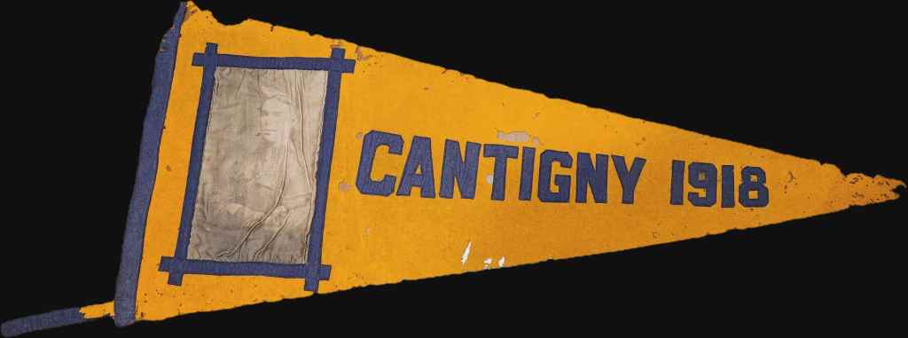 Training and engineer work continued for Hellner’s unit until the 1st Division was called into action again. On May 28th, 1918 the 28th infantry regiment had attacked and successfully captured the French town of Cantigny. The 1st Engineers moved into the sector and began work fortifying the area and digging trenches. Hellner memorialized his service there with a large pennant that bears “Cantigny 1918” and his portrait which speaks to the fame of the battle at the time. While in these trenches at and around Cantigny, B company experienced shelling and fought off diversionary attacks from the German’s Montdidier-Noyon offensive that was aimed at nearby French positions.