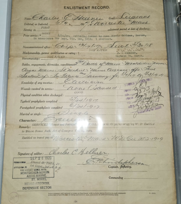 In December the 1st division was sent into Germany to be a part of the army of occupation. The 1st Engineers remained on this post until July 21st, 1919 when they were detailed to finally return home. He returned to the United States in August and was supposed to receive a discharge but a medical officer advised him to re-enlist so that his wounds from Soissons could finally be tended to by army doctors. This was when the true extent of his injury was truly discovered. It was necessary to fracture his dislocated arm to get it back into its socket. After this though, he could finally return to Southbridge. Funnily enough, even after his wounds from Soissons were corrected, he wasn’t given credit for a wound in action. So his only wound according to his enlistment record was being gassed on Hill 269. Hellner got married in June of 1921 and went on to have two daughters. In later life he moved to Florida and passed away there on June 26th, 1975 at the age of 78.