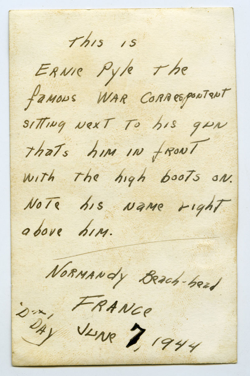 Casual followers of this blog (as well as some dedicated followers) will know that I’m obsessed with casual snapshots of celebrities during the war. I’m more interested in obscure personalities that rarely show up on eBay. My collection includes shots of Spike Jones, Joe Brown, Frank Sinatra, Ernie Pyle, and Lee Marvin. A few months back I was lucky to add another shot of famed WWII journalist Ernie Pyle to my collection. Sorry for the delay!