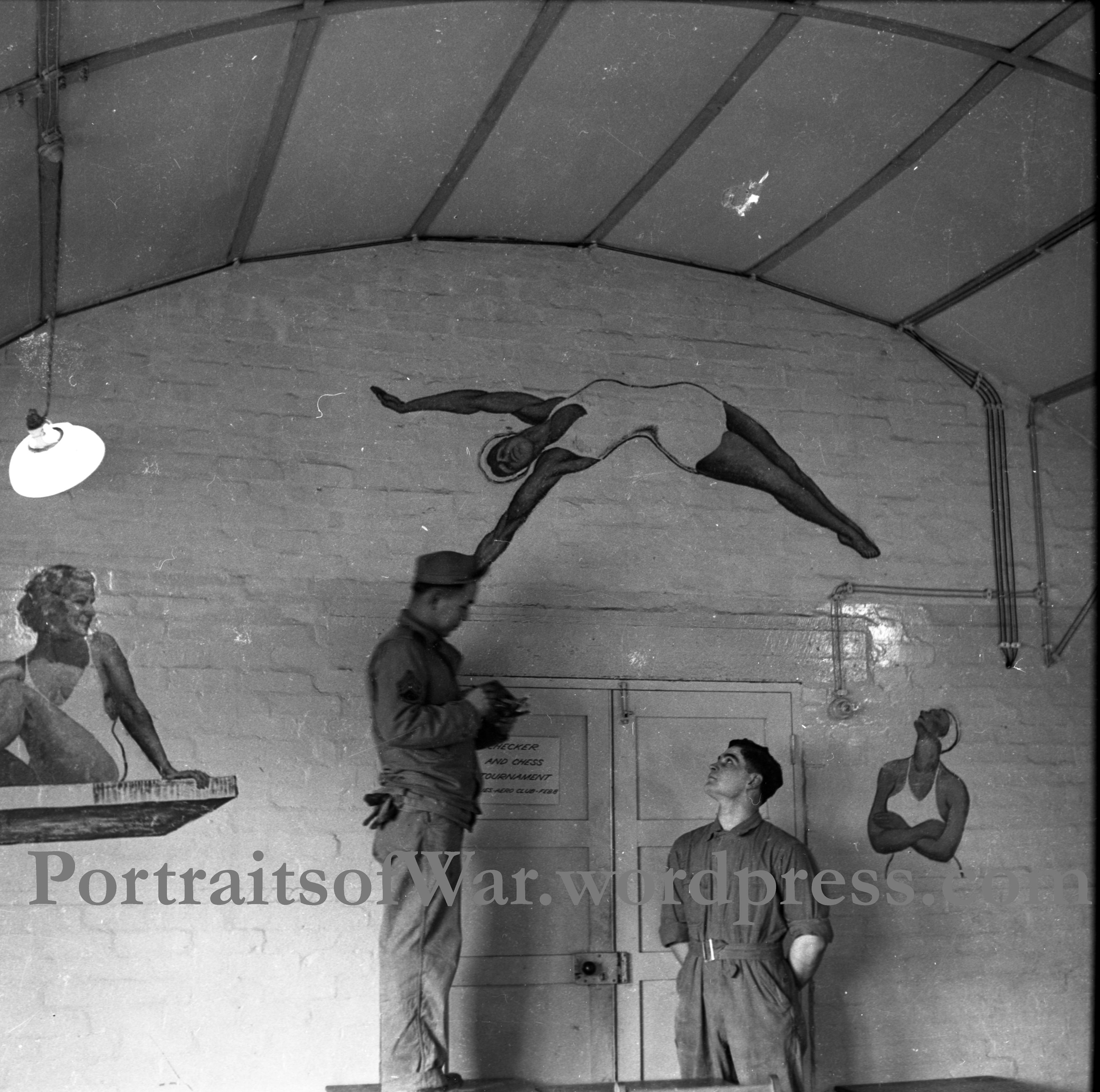 My quest to discover the mysterious background of a WWII artist started nearly two years ago with the acquisition of a grouping of photographs and negatives from a seemingly nameless soldier. I soon was able to deduce his name – Alva Alegre, and began the incredibly interesting voyage of tracking down his true identity. His photography is hauntingly personal, unveiling the often unseen side of war; the everyday life of the 388th Bomb Group. The journey has introduced me to dozens of people with connections of “Al”, from 94 year old bomber pilots who fondly remember seeing his artwork behind the Officers Bar in England, to military engineers who knew him later in life. I’ve spent hundreds of hours (really!) scanning his photographs and dozens more hours researching his life.
