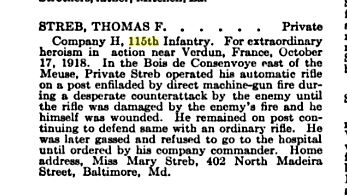 The President of the United States of America, authorized by Act of Congress, July 9, 1918, takes pleasure in presenting the Distinguished Service Cross to Private Thomas F. Streb (ASN: 1285690), United States Army, for extraordinary heroism in action while serving with Company H, 115th Infantry Regiment, 29th Division, A.E.F., near Verdun, France, 17 October 1918. In the Bois-de-Consenvoye east of the Meuse, Private Streb operated his automatic rifle on a post enfiladed by direct machine-gun fire during a desperate counterattack by the enemy until the rifle was damaged by the enemy’s fire and he himself was wounded. He remained on post continuing to defend same with an ordinary rifle. He was later gassed and refused to go to the hospital until ordered by his company commander.