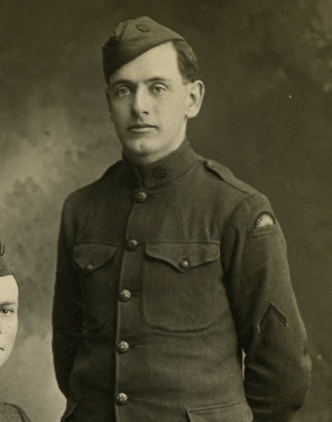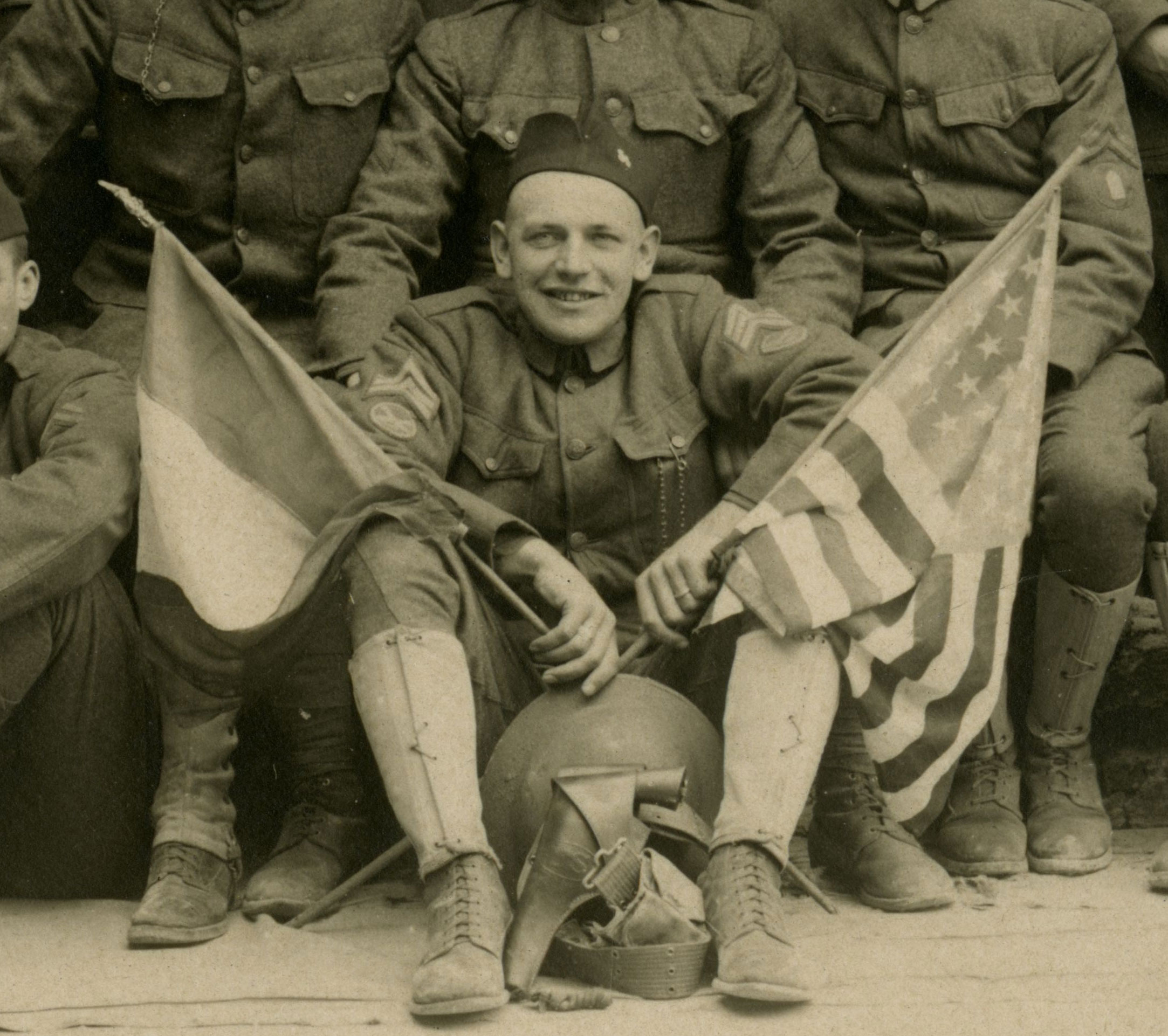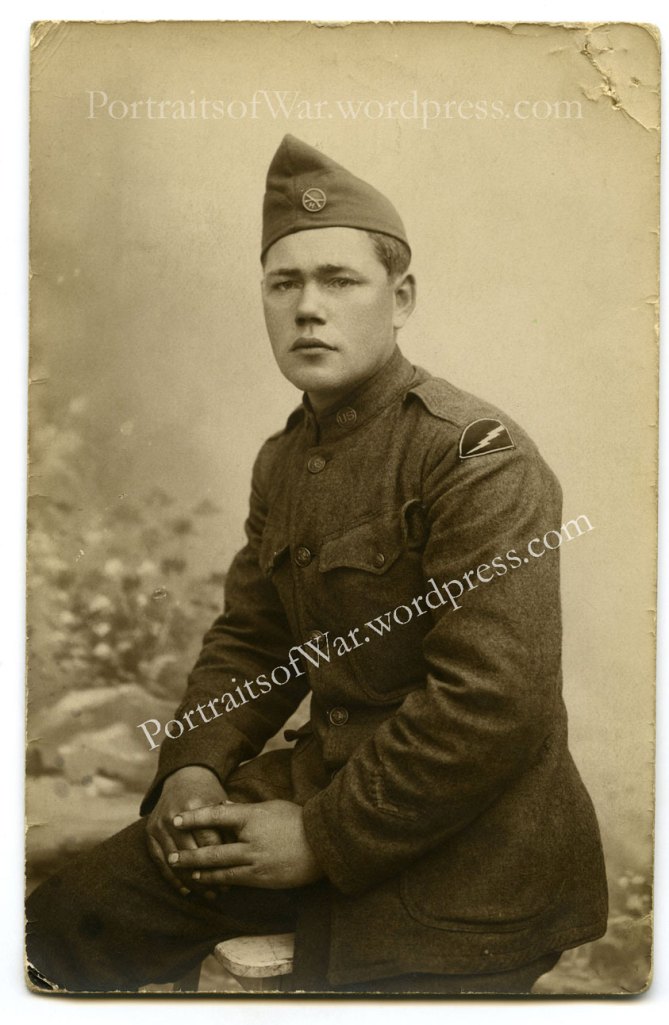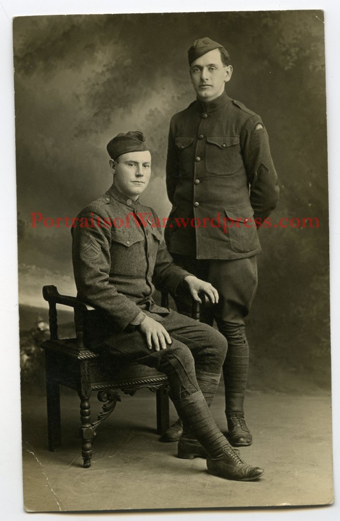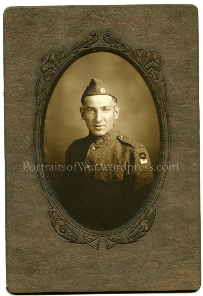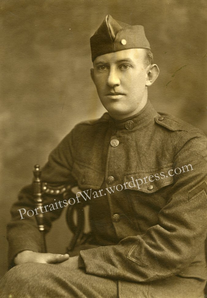 Pearson was from West Falmouth, Maine and was born in January of 1893. He enlisted with the National Guard in Portland in March of 1917 and reported for Federal service in June of that year. He was overseas from March of 1918 to March of 1919. This photo was taken in either late March, or April or May of 1918. He was promoted in early June of 1918. Since this photo shows him as a Corporal at the time of the photo, we know it was taken before his promotion. Also, his lack of OS chevron and the abundance of spats likely points towards an early photo taken in France.