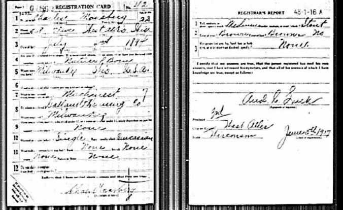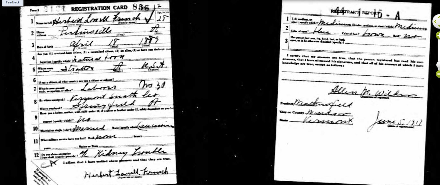 I am fortunate enough to own a copy of the hard-to-find 101st Machine Gun Battalion unit history.  Wagoner John J. Corcoran is listed with a frontal snapshot beside his biography.  He was born on May 29th, 1890 in Maine and eventually made his way over to Vermont where he lived in Lunenburg, VT working as a paper maker with the Gilman Paper Company.  He enlisted at Fort Ethan Allen on June 29th, 1917 with the 1st Vermont Infantry, where he was later transferred into the 103rd MG of the 26th Division.  His WWI and WWII draft cards were both listed on ancestry.com and I’ve included them below along with a copy of his death record.  He passed away in 1947 and is buried in Lunenburg.  I hope to travel there soon to take a photo of his grave!