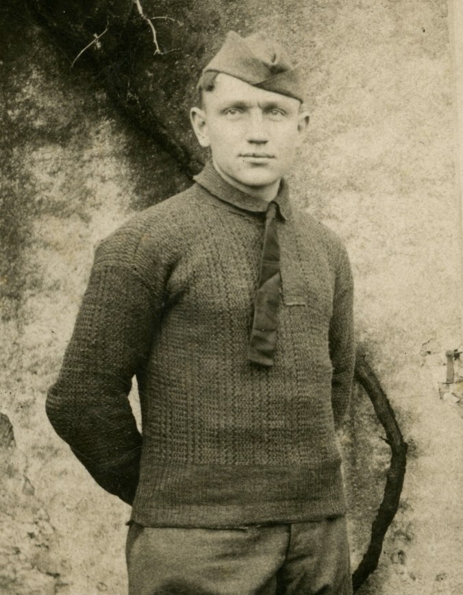 Charles H. Maasberg was born on July 2nd, 1894 in Wisconsin and enlisted for the draft on June 5th, 1917.  Although I can’t be sure when he was sent overseas, I can deduce that he was assigned to an ordnance handling unit.  He rose to the rank of Sergeant by 1919, and returned home to the US soon thereafter.  This wonderful outdoor posed shot was taken in France in 1918, and shows Charles posing in a hand-knit sweater complete with tie.  I can only imagine that it was taken in the backyard of a rural French home given the broken flower pots and creeping vines on the wall.  The lack of foliage may help us date the photo to the fall or winter months.  This would date the photo to the September-November of 1918 period.