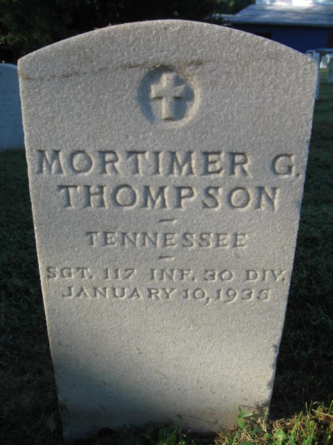 Mortimer Grinnell Thompson was born on December 29th, 1897 (other sources say 1887) to C. Mortimer and Hattie C. Thompson in Knoxville, Tennessee.  He entered Federal service on May 21st, 1917 and eventually ended up as Sgt. with the 117th Infantry Regiment of the 30th Division. At this time, I can’t find much about his military service other than the basic facts.  With some more in-depth searching I may be able to elucidate some aspects of his service that have been all but forgotten over the past (nearly) 100 years.  He married after the war to a Celeste P. Condon and had at least two children named Mortimer G. Thompson Jr. and Harriet A. Thompson in the late 1920s.  Mort is listed as a painting contractor.