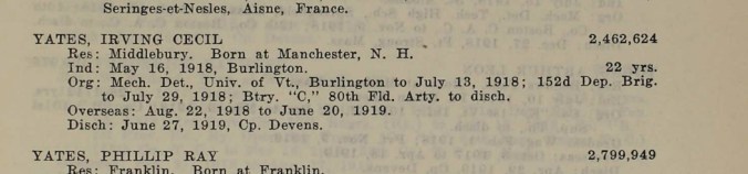 Irving C. Yates was born in Manchester, NH in 1896 and soon moved across the Connecticut River to the good ol’ land of Vermont. He lived in Bellows Falls for awhile before shipping off to Middlebury. He enlisted at the University of Vermont and trained on those hallowed grounds (my Alma Mater) until August of 1918 when he shipped out for France as part of the 6th Division, 80th Field Artillery Battalion. Presumably he worked in some capacity with 155mm guns.