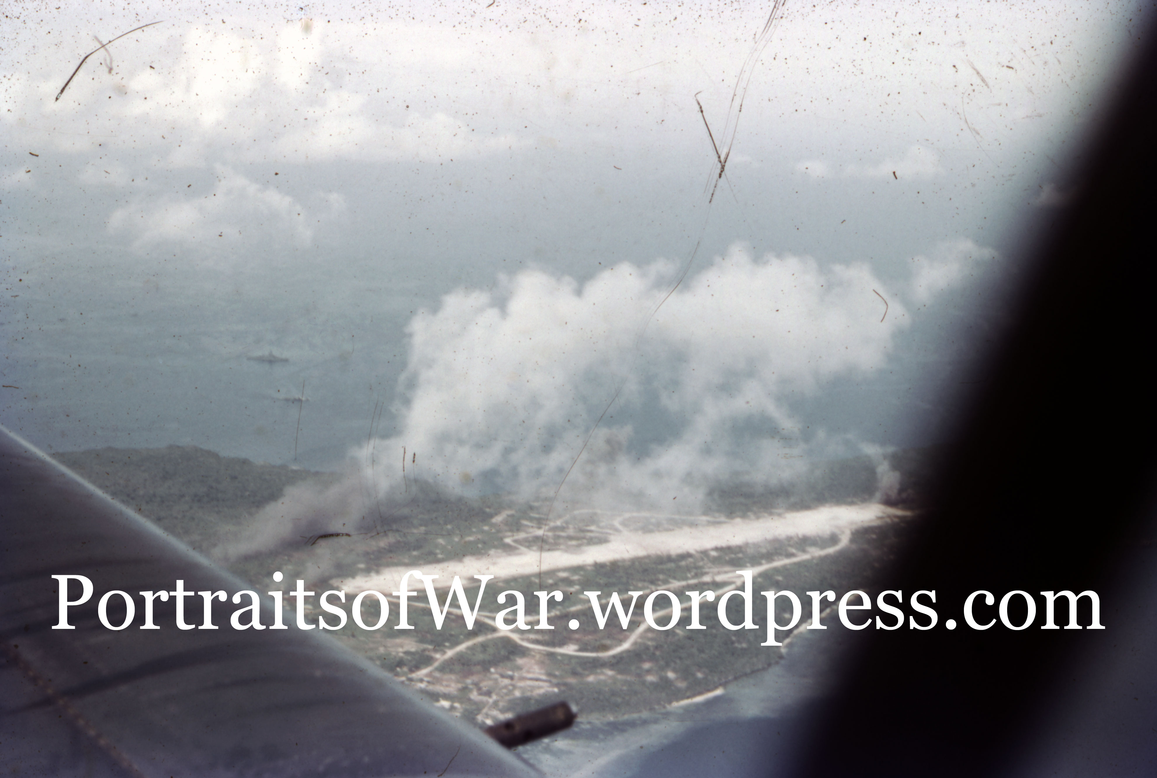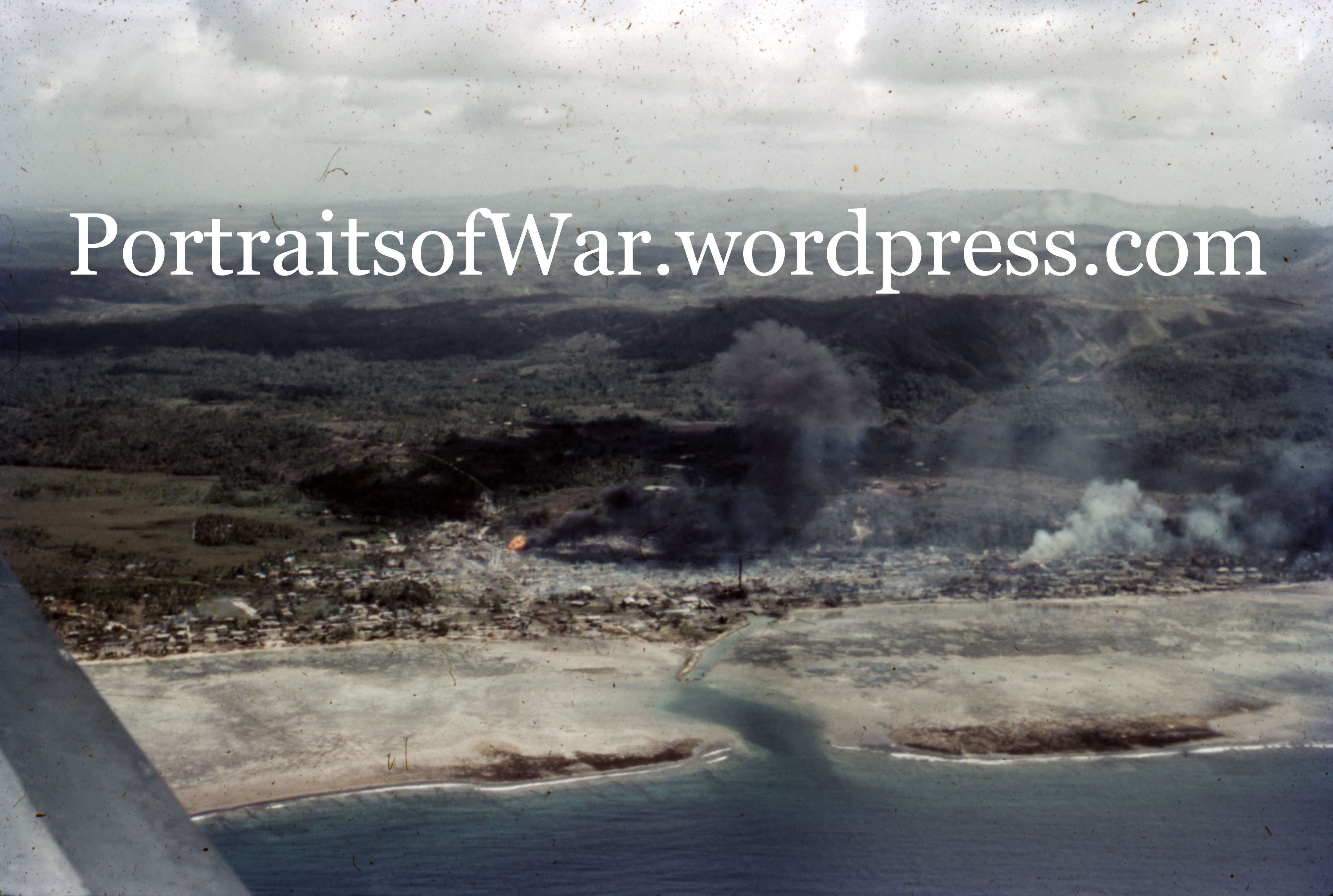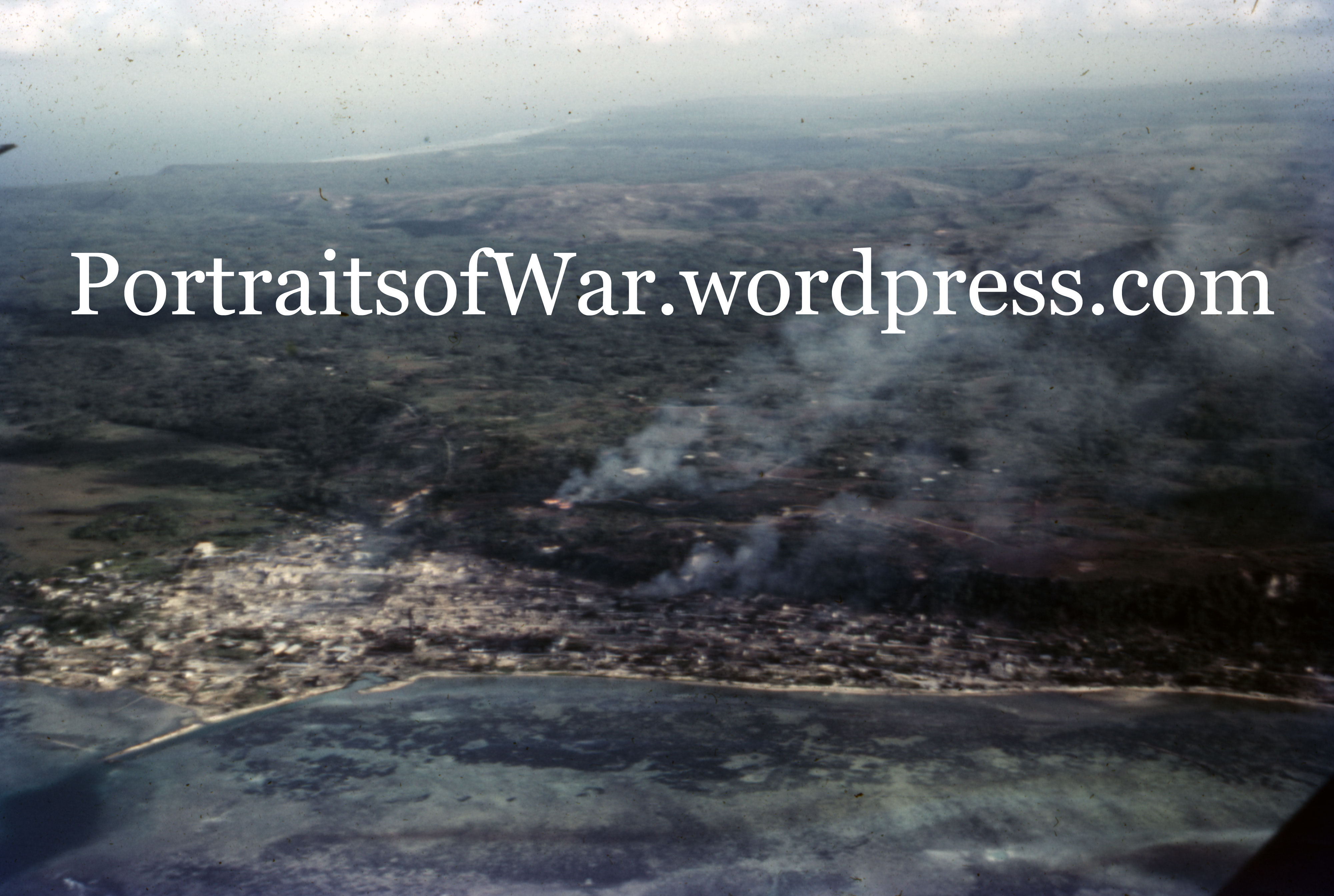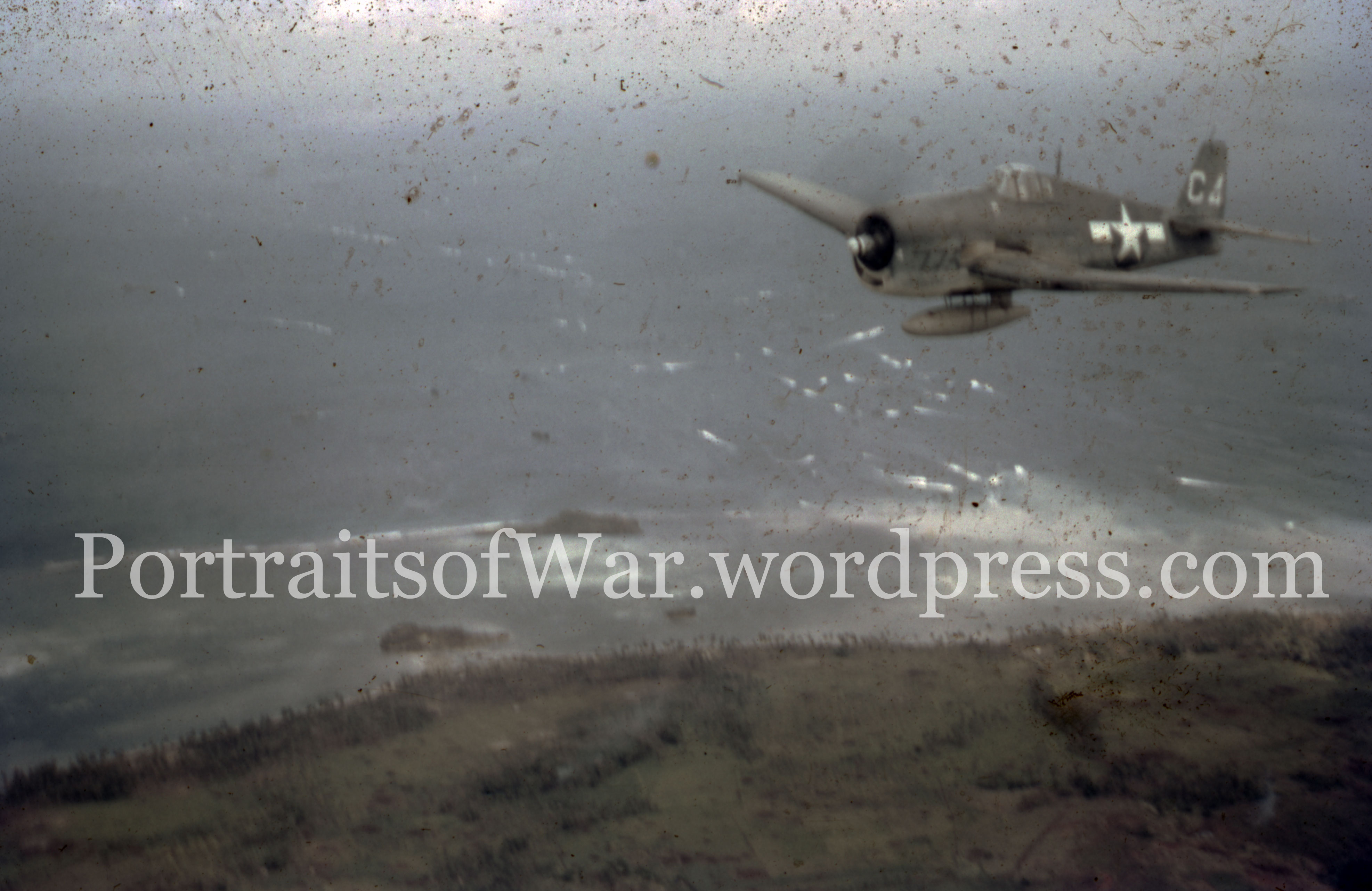 Shot from the cockpit of a F6F-3 Hellcat flown by Edward W. Simpson Jr. of the VF-35, this incredible set of images depicts the opening few hours of the infamous Invasion of Guam. Simpson carried his Kodak 35mm camera loaded with color film during many of the key battles of the Pacific, and PortraitsofWar has been lucky enough to acquire the entire collection. In this installment, I’ve scanned a series of shots taken during the Guam invasion. Many are identified as to location and were verbally described on a cassette tape that accompanied the collection.